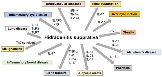 This section summarizes the association with HS and systemic inflammatory diseases such as cerebrocardiovascular diseases, renal dysfunction, liver dysfunction, Alzheimer’s disease, osteoporosis, chronic obstructive pulmonary disease (COPD), inflammatory eye disease, inflammatory bowel disease, hypothyroidism, alopecia areata, psoriasis, psychological depression, obesity, and cancers. In addition, the possible pathogenesis of HS-mediated inflammatory responses is summarized.