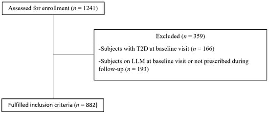 Of the initial study participants (n = 1241), 882 subjects were eligible for the present study (Figure 1): 57% were males; their median age was 55 (47–63) years and median BMI was (27.2 (24.8–29.9) kg/m2); 57% had hypertension; 38% fulfilled the criteria of metabolic syndrome; and 27% were assigned to high-intensity statin therapy. During the follow-up (6 years; IQR: 4–10 years), 11% of the study participants developed T2D.