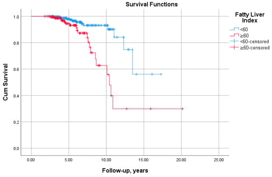 Kaplan–Meier survival curve as stratified by fatty liver index (FLI). FLI ≥ 60 was associated with significantly reduced event-free survival from type 2 diabetes (log-rank = 15.46, p = 0.001).