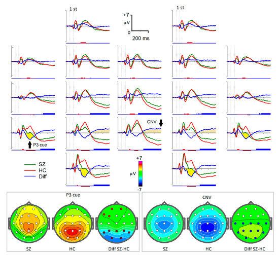 Figure 1. Grand average 19-channel ERPs for the two groups for the cue condition when the first stimulus in a trial was an image of the animal and the subjects had to prepare for the following stimulus. Green lines—patients with schizophrenia (SZ). Red lines—healthy controls (HC). Blue lines—difference waves SZ-HC. Marks below ERPs on each channel—statistically significant (p < 0.05) differences between the clusters (indicated by different colors).