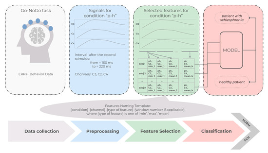Figure 4 depicts a flowchart showing the stages of data processing for a particular condition ‘P–H’. The ERPs and behavior data were collected during the experiment. There is a set of conditions that dictate what signals and what intervals should be taken from the ERPs for further analysis. These chosen signals were passed through the feature selection step, which extracts features according to the parametrized procedure described above. Finally, the extracted features were passed to a classification model.