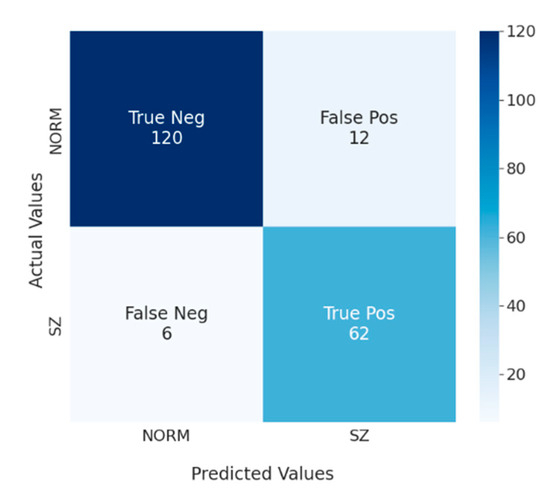 Figure 5 represents a confusion matrix for SVM (behavior, SFSB) that was also calculated on the cross-validation. The procedure of its calculation was as follows: on each fold, the model with the best parameters was trained on the training set and counts of true/false negatives/positives were calculated on the test set. Afterward, these counts were summed up. In this way, the resulting confusion matrix takes into account all of data and uses metrics from the test sets only. As can be seen from the matrix, the model correctly identified 121 out of 132 healthy individuals as healthy, classified correctly 62 out of 68 individuals with diagnosed schizophrenia, misclassified 12 healthy people as people with schizophrenia, and six times mistakenly classified individuals diagnosed with schizophrenia as healthy people.