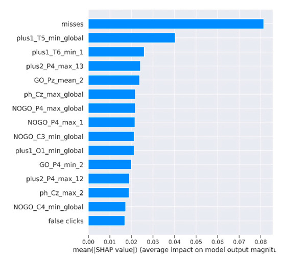 The SHAP method allows for the global variance importance to be calculated for each feature. The variance importance of 15 of the most important features of the model SVM (behavior, SFSB) is depicted in Figure 6. Features were sorted by a decrease in their importance on the Y-axis. The X-axis shows the mean absolute value of SHAP. Names of the ERP features are presented using the template {condition}_{channel}_{type of feature}_{window number if applicable}, where {type of feature} is one of ‘min’, ‘max’, ‘mean’.