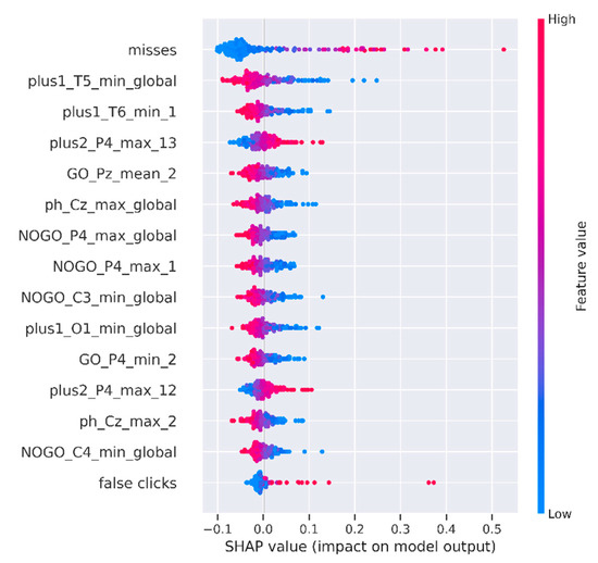 Aside from the absolute values of the feature importance, it is interesting to analyze the direction in which each feature has an influence. This visualization is presented in Figure 7. On the Y-axis were again the top 15 features sorted by their importance, and on the X-axis were the SHAP values. Values to the right from the zero point on the X-axis represent a class of schizophrenics, and values to the left are healthy individuals. A red color means a larger value of the feature. The redder the value of the feature, the larger its value. The width of the lines means more observation points. For example, we can see that a small number of misses was more typical for healthy people, while a smaller value of the channel T6 minimum for paradigm ‘plus1′ increased the probability of being diagnosed with schizophrenia.