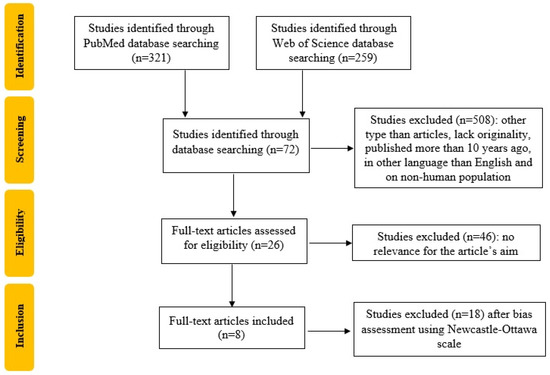We registered a systematic review protocol under the number CRD42022376006 in Prospero that followed the recommendations of Preferred Reporting Items for Systematic Reviews and Meta-Analyses (PRISMA). Furthermore, we used the Population, Intervention, Comparison, Outcome, and Study Design (PICOS) strategy to guide our study rationale and to conduct a clear, useful and systematic literature search. We conducted the systematic literature search in the PubMed and Web of Science databases which include original full-text articles, randomized control trials and clinical trials, from 1 January 2012 up to 20 November 2022, published in English, with the “thrombophilia AND (pregnancy OR diagnostic criteria) AND fetal growth restriction” criteria. We identified 7 articles on PubMed and 65 articles on the Web of Science database. The exclusion criteria were duplicates, articles that lack originality, published in languages other than English, and on non-human populations. Two researchers, BMM and TS, extracted the included studies’ titles and abstracts, screened them for relevance for the present study theme and selected the relevant ones by performing cross-screening. As a result, 26 articles were selected, and after the bias assessment using the Newcastle–Ottawa Scale [15], 8 articles were included, as shown in Figure 1.