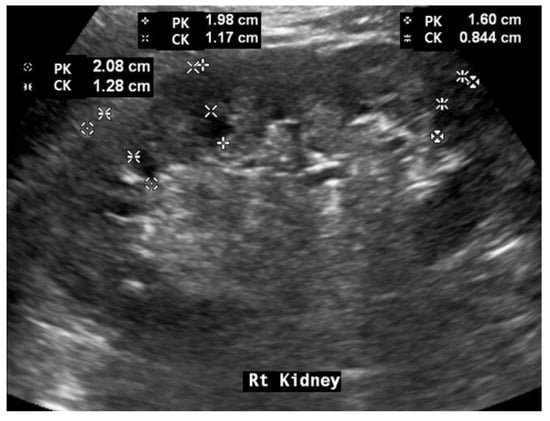 Ultrasonographic measurement of renal dimension, and, in particular the cortical thickness, suffers from high inter- and intra-observer variability, so it is not commonly used due to poor cortico-medullary differentiation [26]. In our study, in order to reduce the inter-observed variability for the measurement results between the three investigators, we calculated the average of the cortical and parenchymal thicknesses of the upper, middle, and lower poles of each height. In addition, CK/PK was used in the calculation formula of renal scoring to reduce the variability of measured values.