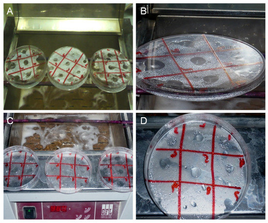Thin layer immunoassay steps to detect the antibody titer. (A) Incubation of polystyrene plate along with different dilutions of patient’s serum over water bath. (B) Plate containing droplets after 1 min incubation over bath. (C) Water droplets after rinsing with distilled water, blow dried, and again inverted over the water bath at 60 °C. (D) Plates showing water droplets regarded as positive results for H. pylori.