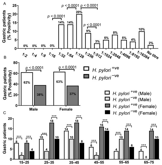 In this study, 214 patients were enrolled between the age of 15 and 75 years (65% females and 35% males). Overall seropositivity of H. pylori infection was found to be 63% by TLI as compared to 87% by wELISA [28] and 92% by sELISA [29]. Female (63%) and male (62%) patients were found to be H. pylori seropositive with sex-wise distribution (Figure 2B). However, age-wise distribution showed slight differences in the risk of seropositive H. pylori in gastric patients. We found a high risk of infection between the younger age groups of 15–25 years (73%) and 25–35 years (67%) as compared to the middle ages of 45–55 years (58%), and 55–65 years (53%) have a low risk of infection. Male patients (15–25 years) were shown to have a high risk of infection (36%), while older patients (55–65 years) showed low (12%) prevalence of H. pylori infections. In contrast, the highest risk of infection in the female population was found between the ages of 65–75 years (50%). Female patients (15–65 years) showed a moderate risk of infection (36–43%) (Figure 2C).