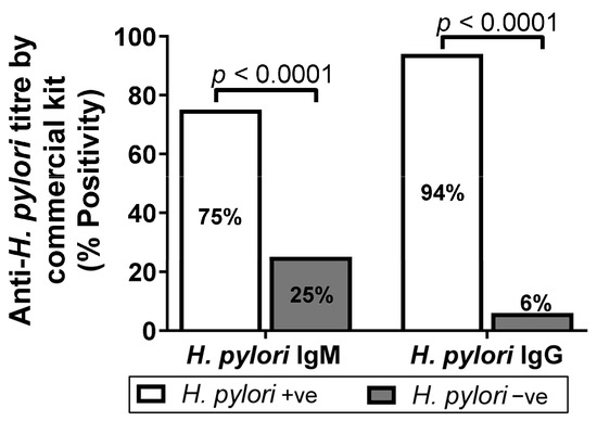 3.3. Analysis of Anti-H. pylori IgM and IgG Titer by Commercial Kit ELISA (kELISA)