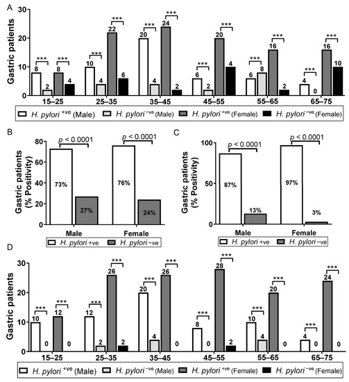 (A) Age-wise distribution of H. pylori infections in gastroduodenal ulcer and gastritis patients by IgM commercial ELISA kit (kMELISA). (B) Sex-wise distribution of H. pylori infections in gastroduodenal ulcer and gastritis patients by IgM commercial ELISA kit (kMELISA). (C) Sex-wise distribution of H. pylori infections in gastroduodenal ulcer patients and gastritis by IgG commercial ELISA kit (kGELISA). (D) Age-wise distribution of H. pylori infections in gastroduodenal ulcer patients and gastritis by IgG commercial ELISA kit (kGELISA). Three asterisks (***) indicate p value smaller than 0.001 (p,0.001).