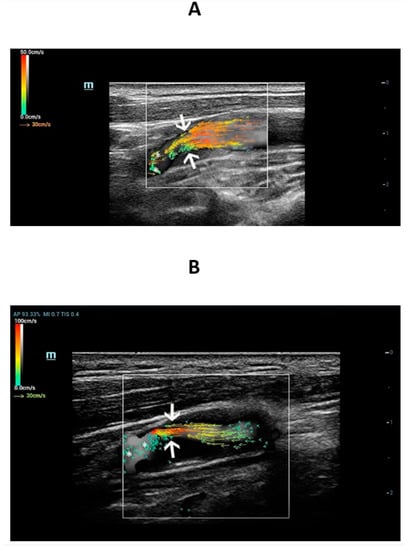 The high-frame-rate vector flow imaging technique (V Flow) is a novel ultrasound technique that can facilitate the assessment of carotid arteries using the intuitive and quantitative vector arrows [14,15]. It can depict the blood flow features of carotid arteries in a real-time scan, especially the complex blood flow [16]. In addition, V Flow can provide the quantitative parameter named wall shear stress (WSS), which is the frictional force between blood flow and the endothelial surface of the vessel wall [17,18,19]. Non-invasive measurement of WSS may provide more information in the diagnosis and decision-making process of carotid stenosis [20]. In our previous work, V Flow proved to be a feasible imaging method for the WSS assessment of the common carotid artery in healthy volunteers [18]. However, the value of V Flow for assessing the carotid stenosis in aging patients has not been reported.