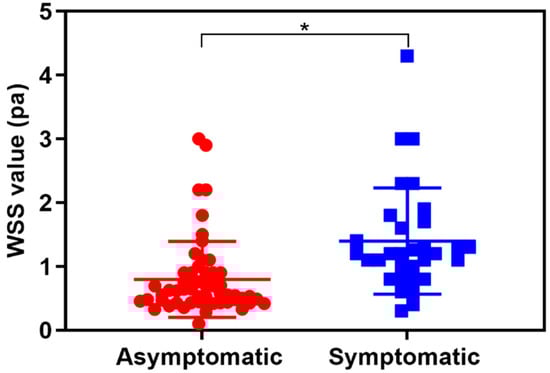 The wall shear stress (WSS) value of the asymptomatic and symptomatic carotid stenosis. * p < 0.05.