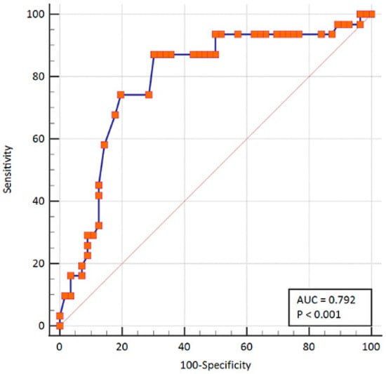 The WSS value of symptomatic carotid stenosis (1.4 ± 0.15 Pa) measured at the stenotic segment was significantly higher than that of asymptomatic carotid stenosis (0.80 ± 0.08 Pa) (p < 0.05) (Figure 2). Taking a WSS value > 0.78 Pa as diagnostic criteria for symptomatic carotid atherosclerotic stenosis, the AUROC was 0.79 with 87.1% sensitivity and 69.6% specificity (Figure 3). Furthermore, significant differences in WSS values of symptomatic and asymptomatic patients were independent of the carotid stenosis grade (p < 0.05).