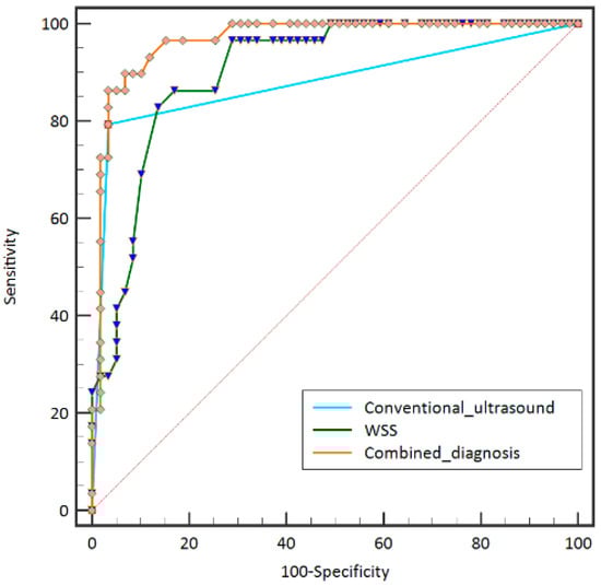 The comparison of diagnostic efficacy of wall shear stress (WSS), conventional ultrasound, and combined diagnosis in differentiating the severe carotid atherosclerotic stenosis.
