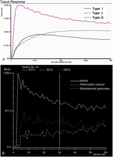 (A) SI-T curves of all nontumoral pancreatic tissue showed type I pattern enhancement. Pancreatic tumors showed type II or type III pattern enhancement; (B) Curve graph shows that pancreatic tumor enhances lesser than surrounding nontumoral pancreatic tissue. Time–signal–intensity curves selected for further data evaluation: type I, characterized by quick enhancement and quick washout; type II, with slow enhancement, which is followed by slow constant enhancement; type III, slow enhancement followed by slow washout [6].