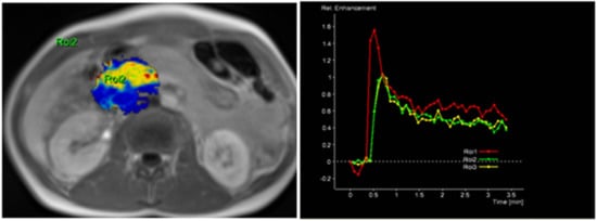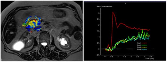 Without the hazard of ionizing radiation, dynamic contrast-enhanced magnetic resonance imaging (DCE-MRI) is a noninvasive imaging modality that can provide anatomical and physiological information of the tumor [5,6,7,8,9,10]. Preliminary studies supported the importance of magnetic resonance (MR) perfusion in the evaluation of abdominal organs [5,11,12,13,14]. The aim of the study was to analyze DCE-MRI perfusion parameters in normal pancreatic parenchymal tissue and PDAC and to estimate the efficacy of this diagnostic modality in determining the tumor grade.