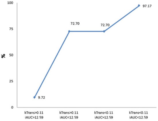 Calculated probability for the presence of poorly differentiated PDAC. The graph shows the prognosticated probability of G3 PDAC (%) if the Ktrans and iAUC parameters or both of them exceed the defined cut-off value (Ktrans < 0.11, iAUC < 12.59). If both parameters are less than the determined cut-off point, the prognosticated probability for the presence of G3 PDAC is 9.72%; if both values exceed the defined cut-off point, the estimated probability for the existence of PDAC is 97.17%.