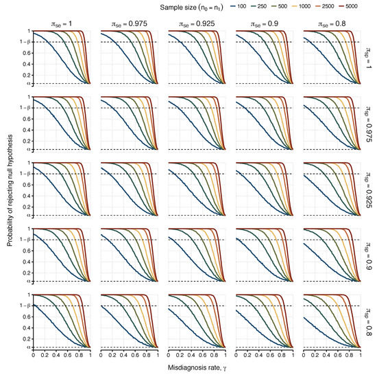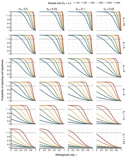 For each misdiagnosis scenario, parameter set, and sample size, we simulated 10,000 data sets to estimate the power of detecting an association under the presence of misdiagnosis. A detailed description of the simulation procedure can be found elsewhere [11,27]. In each data set, we rejected the presence of association if the p-value of Pearson’s test was greater than the usual 5% level of significance. For each parameter combination, the power () was estimated by the proportion of the simulated data sets in which an association was detected. To facilitate the understanding of the simulation results, we specified a target power of at least 80%.