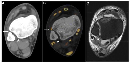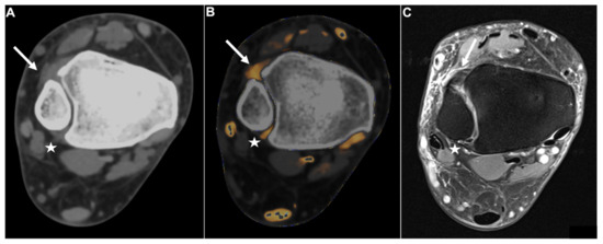 PTIFL strain. Standard axial unenhanced grayscale CT (A), color-coded collagen reconstructions (B), and proton density-weighted unenhanced MRI series with fat saturation (C) of a patient with an ankle sprain. While the ATIFL (arrow) and PTIFL (star) are visible in the grayscale images, no diagnostic assessment of both ligaments is accurately possible. After collagen mapping, the ATIFL is visible and intact (arrow). However, no collagen signal can be acquired for the PTIFL (star), suggestive of rupture. MRI images show an intact ATIFL (arrow) and a partial tear of the PTIFL (star), which likely caused a drop of the collagen content below acquirable thresholds. Abbreviations: ATIFL, anterior tibiofibular ligament. PTIFL, posterior tibiofibular ligament.