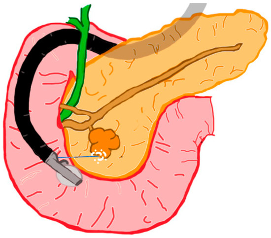 - Armellini, E.; Crinò, S.F.; Ballarè, M.; Occhipinti, P. Endoscopic ultrasound-guided radiofrequency ablation of a pancreatic neuroendocrine tumor. Endoscopy 2015, 47, E600–E601. [Google Scholar] [CrossRef]