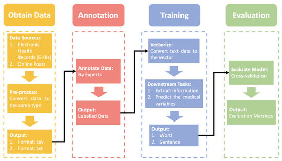 First, we need to obtain the raw data, the data sources are usually public or local electronic health records (EHRs) and posts on the web. As raw data, the individuals we collect can vary greatly from one another. We should do pre-processing to unify the text structure. However, before we annotate the data, the data is usually stored in .csv or .txt format. The professional annotation process invites multiple experts to cross-annotate the data several times. Then, we input the labeled data into an ML-based NLP model for training. It should be noted that the data needed for the ML-based NLP model is vectors. Many models can help us convert text into vectors, such as word2vec [17] and bag-of-words [18]. Then, the ML-based NLP model is used to extract the required information or predict medical variables based on different downstream tasks in a step-by-step training process. In the final evaluation phase, we validate the trained model with cross-validation. Cross-validation is more objective and unaffected by imbalances in the validation data set than a one-time validation. After that, evaluation matrices are calculated based on evaluation criteria for quantitative evaluation.