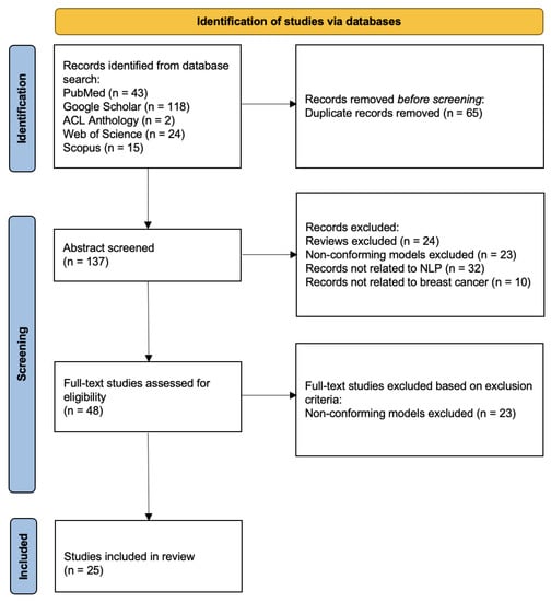 In a systematic review, we have followed the process of the preferred reporting items for systematic reviews and meta-analyses (PRISMA). In the above search phase, we have counted a total of 202 papers (43 via PubMed, 118 via Google Scholar, 2 via the Association for Computational Linguistics (ACL) Anthology, 24 via Web of Science, and 15 via Scopus). After removing duplicate records, 137 papers have been chosen for abstract screening. We have selected the papers based on whether the abstract describing the paper is a review, contains conforming models, is related to NLP, or is related to breast cancer. In order to determine the conforming models, we have followed several main points: 1. Papers that simply compare the results of different models have been filtered out; 2. word-embedded models have been filtered out; 3. papers whose purposes are not to develop an NLP breast cancer application have been filtered out; 4. models that are not based on ML have been filtered out. There have been 48 papers that passed the abstract screening. In the full-text screening, we have mainly performed secondary screening of conforming models for papers that do not mention model information in the abstract. Finally, 25 papers have been included in this systemic review. Figure 2 shows the overall process.