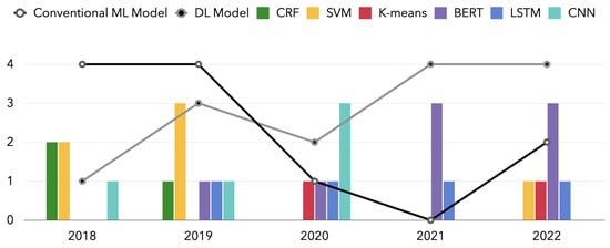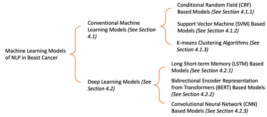 In this section, we have mainly divided the machine learning models of NLP in breast cancer into two categories: conventional machine learning models and deep learning models. The conventional machine learning models can be subdivided into conditional random field (CRF) [19] based models, support vector machine (SVM) [20] based models, and K-means clustering algorithms [21]. The deep learning models can be subdivided into long short-term memory (LSTM) [22] based models, bidirectional encoder representation from transformers (BERT) [23] based models, and convolutional neural network (CNN) based models [24]. Figure 3 shows the overview of this section.