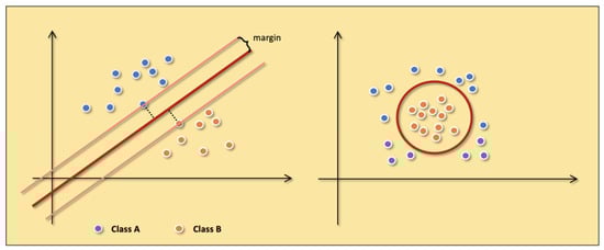 In the ideal case, the data are linearly separable. We can directly follow the basic idea of maximizing the margin to train a linear SVM. However, more real-world data is close to being linearly differentiable. In this situation, the SVM is trained by adding slack variables to maximize the soft margin. The slack variable means we allow the SVM to cause a small number of classification errors when classifying. Moreover, the slack variables not only enable SVM to handle data with near-linear partitions but also alleviate the problem of SVM overfitting. In addition to linearly divisible and approximately linearly divisible data, SVM also deals with linearly indivisible data. The key to handling linearly indivisible data is that we need to map the data to a higher-dimensional space so that the data is linearly divisible. The mapping is done by adding a suitable kernel function to the SVM. The kernel function simplifies the process of mapping the samples from the low-dimensional space to the high-dimensional space and the inner product of the corresponding variables. Figure 7 shows examples of linearly divisible samples and linearly indivisible samples.