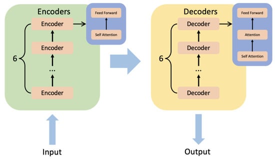 BERT [23] is a pre-trained fine-tuning model based on transformer [41]. The significance of BERT is that we have satisfied Transformer’s massive parameter training with unlabeled data. The transformer is a model that uses an attention mechanism to improve training speed and accuracy. The structure of the transformer can be simply summarized as encoders and decoders. There are six minor encoders and six minor decoders. Figure 9 shows the inner structure of encoders and decoders. A minor encoder includes a self-attention mechanism and a feed-forward neural network. A minor decoder includes a self-attention mechanism, an attention mechanism, and a feed-forward neural network.