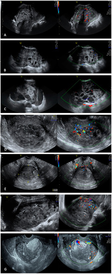 - Exacoustos, C.; Romanini, M.E.; Amadio, A.; Amoroso, C.; Szabolcs, B.; Zupi, E.; Arduini, D. Can Gray-Scale and Color Doppler Sonography Differentiate between Uterine Leiomyosarcoma and Leiomyoma? J. Clin. Ultrasound JCU 2007, 35, 449–457. [Google Scholar] [CrossRef] [PubMed]