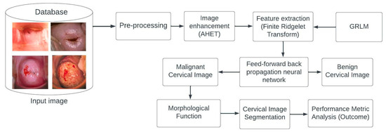 A computer-aided automatic detection system is the proposed method for detecting cervical cancer. Figure 2 depicts the overall process for the detection mechanism. The original cervical image is first pre-processed using the associated histogram equalization technique for image enhancement, after which the enhanced image is transformed using the finite ridgelet transform. Then, features like ridgelets, gray-level run-length matrices, moment invariant, and enhanced local ternary pattern are extracted from the pre-processed image. By comparing the cervical image with the trained features, the neural network classifier is trained to classify the tumor as benign or malignant. Performance metric parameters such as sensitivity, specificity, and accuracy are used to analyze the cervical image classification.