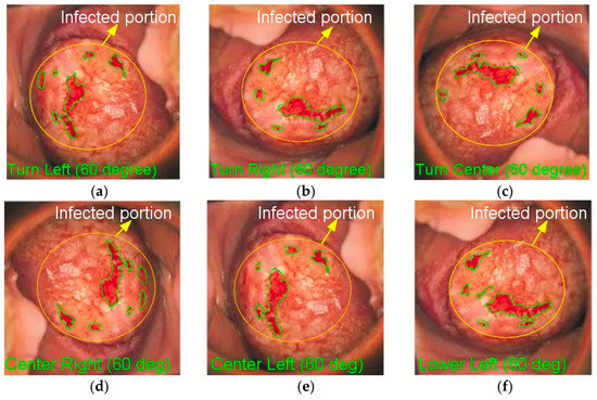 Cervical cancer 60° orientation images: (a) TL; (b) TR; (c) TC; (d) CR; (e) CL; (f) LL.