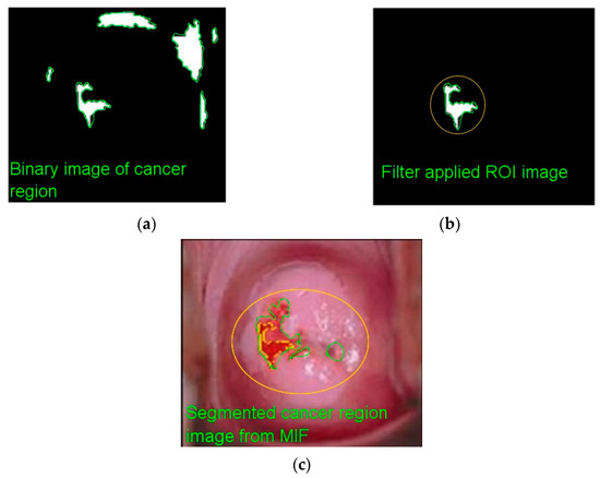 Different images: (a) binary; (b) ROI; (c) cancer segmented.