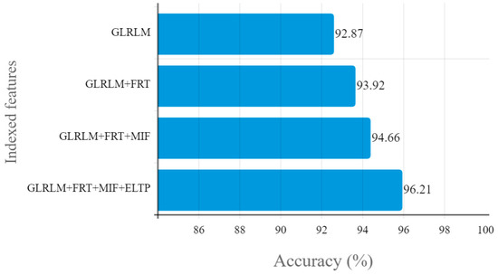 Table 3 illustrates the feature indexed accuracy values of cervical cancer segmentation. The proposed system obtained 92.87% accuracy with GLRLM features, 93.92% accuracy with GLRLM + finite ridgelet transform features, and 94.66% accuracy with GLRLM + finite ridgelet transform + moment invariant features. Finally, the proposed system obtained 96.21% accuracy with GLRLM + finite ridgelet transform + moment invariant features + enhanced local ternary pattern. Figure 9 depicts a graphical illustration of the cervical cancer segmentation accuracy outcomes of different features.