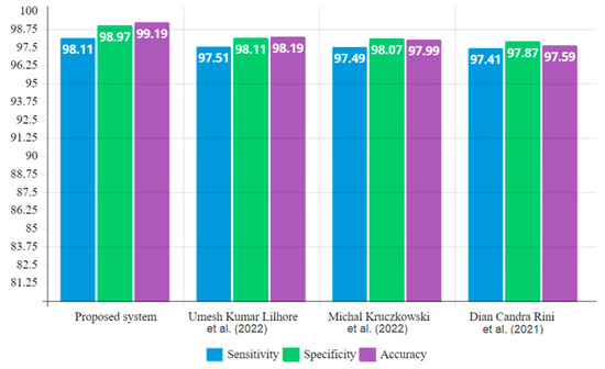 Table 4 summarizes the performance metric comparison of the proposed cervical cancer segmentation technique and other traditional methods; the proposed system obtained superior performance metric outcomes to other methods, yielding 98.11% sensitivity, 98.97% specificity, and 99.19% accuracy. Figure 10 depicts a graphical illustration of performance metric comparison outcomes of the proposed method and existing methods. In this paper, the proposed model is tested using k-fold cross-validation. In this method of validation, the total number of images of the cervical region is divided into k equal numbers of sample data. The first set of sample data from a set of k samples is used for validation, and the other k-1 sample data are used to train the method. In this paper, the results of the proposed method are checked using two-fold cross-validation with k = 2. The following equation is used to determine the cross-validation error (µ) between k samples: