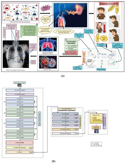 Several studies have shown that the deep learning model trained using chest radiography images has produced better accuracy that can possibly overcome the drawbacks of the RT-PCR technique in the near future. To diagnose and medicate this disease, two types of chest radiological images play a vital role: computed tomography (CT) and X-ray []. In comparison to X-rays, CT scans need high radiation in the screening process []. In this case, although CT scans provide subtle details, X-ray images are available and patients can easily and rapidly have X-ray images in a more cost-saving way. Additionally, an X-ray generates low ionizing radiations and is the less invasive substitute. Therefore, applying X-ray images in order to train deep learning can create a sustainable COVID-19 detection model and alternative to RT-PCR. Considering the benefits of chest X-ray images, we prefer it to CT scans to conduct the investigation of the proposed model. Figure 1a shows the overview of the COVID-19 situation in the environment including symptoms of this disease, testing process, and identification with a confirmed COVID-19 patient’s sample of chest X-ray images.