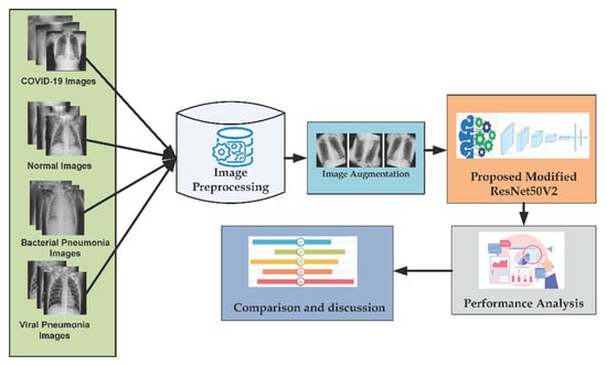 This section includes the description of preprocessing, augmentation of our dataset that is fed to the model to classify COVID-19 cases, the CNN model, and finally, the architecture is designed prior to carry out experiments to analyze the performance. The overview of our suggested methodology is exhibited in Figure 3. In this illustration, first of all, the collected dataset of different class images of cases with COVID-19, regular pneumonia, and normal cases used as input samples. After that, preprocessing of this collected image is performed based on resizing criteria. Then, augmentation on this dataset is completed to increase the diversity of the image data based on some criteria such as rescaling, zooming, shearing and flipping. Afterward, by extending and fine-tuning the ResNet50V2 CNN architecture, the study’s proposed model is developed. ResNet50V2 [] is an enhanced version of ResNet50 [] that outperforms ResNet50 and ResNet101 [] on the ImageNet datasets. A modification or adjustment was applied to ResNet50V2’s extended formulation of the links within blocks. In terms of feature extraction, deeper models do well. However, on account of the characteristics of feed-forward (inputs are passed to the model to gain prediction outcome from complex computations in the model) and back-propagation (weight of the parameters’ update on the basis of prediction result), which is the substance of experimenting deep learning models, highly deep models are difficult to train on account of exploding or vanishing gradients. In this case, ResNets solve this drawback by formulating a residual connection, decreasing the impact of exploding or vanishing gradient and thus enabling the highly deep models to perform better. ResNet50V2 has taken out the last non-linearity, consequently, making the way of input to output such as identity connection. As a result of selecting and developing the ResNet50V2 architecture with extended layers, fine-tuning, and regularization, the proposed model becomes more robust and feasible when compared to other well-studied RESNETS models presented in Table 1. Based on the proposed model, the dataset is classified into binary, three and four-class categories. Then, the performance analysis of the model is completed with different perspectives. Finally, based on the performance results, a general comparison between used datasets is made as well as exploration of the best dataset is also identified.