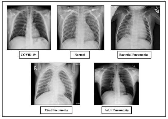 For our experiment, the dataset has been created from three different publicly available sources. The proposed dataset consists of a total number of 4593 chest X-ray images. To avoid the class imbalance problem, we have used a balanced dataset. First of all, the dataset includes 1143 chest X-ray images of COVID-19 patients collected from Kaggle’s repository “COVID-19 Radiography Database” provided by Tawsifur Rahman [] and 1150 normal, 1150 bacterial pneumonia and 1150 viral pneumonia chest X-ray images from “Chest X-Ray Images (Pneumonia)” provided by Paul Mooney []. We have also collected some adult pneumonia dataset from kaggle’s repository “RSNA Pneumonia Detection Challenge” provided by the Radiological Society of North America []. We have used three datasets for our experiment: namely, Dataset-1, Dataset-2 and Dataset-3. Table 4 displays the Dataset-1 distribution for each subset with training and testing the data. In Dataset-1, for training purposes, we have used 60% dataset samples for training purposes and the remaining 40% samples are used for testing purposes. On the other hand, Table 5 shows the Dataset-2 distribution where 100% of the dataset samples are used for training and 40% of the data split from the training dataset is used for testing purposes. Figure 4 displays sample images of chest X-rays with different cases.