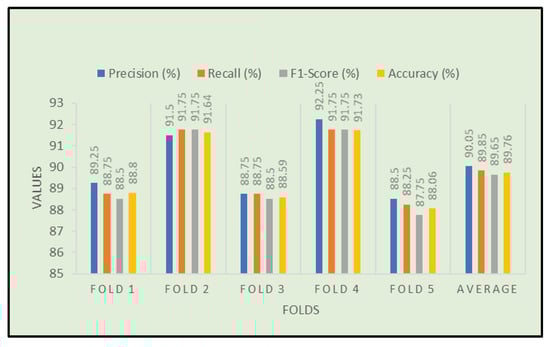 We have applied a five-fold cross-validation approach on a four-class classification problem. In that case, we used 80% data for our training purpose and 20% data for validation. The procedures are repeated 5 times. The final performance is achieved by taking the average of each fold’s values as shown in Table 9. The classification results of fold-4 using four classes are shown in Figure 9. After applying the 5-fold cross-validation procedure, we achieved the highest accuracy of 91.73% on fold-4 and the lowest accuracy of 88.06% on fold-5 among the five folds. Moreover, the overall average accuracy we achieved was 89.76% alongside 90.05% precision, 89.85% recall and 89.65% F1-score, respectively.