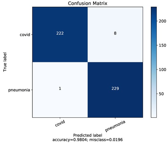 The gradient descent optimization technique Adam Optimizer [] was employed in the suggested architecture. When it comes to solving issues requiring a large number of data samples or parameters, this strategy is highly effective. Adam differs from the standard stochastic gradient descent. The stochastic gradient descent algorithm employed a constant learning rate (called alpha) for all weight changes. On the other hand, Adam used the advantages of AdaGrad and the RMSProp algorithm during training to repeatedly change network weights. A few of the setting options for Adam are alpha, beta1, beta2, and epsilon. In this case, alpha was interpreted as the learning rate or step size. Consequently, the suggested model made use of an adjustable learning rate using a 1 × 10 Adam Optimizer. We have implemented our model to classify the cases of COVID-19 from other cases (bacterial pneumonia, normal and viral pneumonia). We have used different types of class-wise classification categories including four-class, three-class and two-class categories to classify COVID-19 instances. In four-class categories, the classification has been made on COVID-19 cases vs. others (normal cases, pneumonia with bacterial cases and pneumonia with viral cases). In three-class categories, the classification has been made on COVID-19 cases, normal cases and bacterial pneumonia cases, and another fold includes COVID-19 cases, normal cases and pneumonia with viral cases. Again, in two-class categories, the classification has been made in three folds including COVID-19 with normal cases, COVID-19 with bacterial pneumonia cases and COVID-19 with viral pneumonia cases. Again, the four-class classification has been performed on both Dataset-1 and Dataset-2.