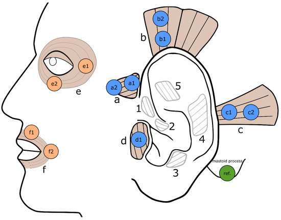 Electrode positioning on the auricular and mimic muscles. a = anterior auricular muscle (AAM); b = superior auricular muscle (SAM); c = posterior auricular muscle (PAM); d = tragicus muscle (TM); e = orbicularis oculi muscle (OOcM); f = orbicularis oris muscle (OOrM); 1–5: other auricular muscles, which are not relevant for this study. Electrodes are placed on auricular muscles (blue circles) and mimic muscles (orange circles). A reference electrode (green circle) is placed on the mastoid process; common ground is placed on the spinous process of C7 (not depicted). Electrodes were placed symmetrically on both sides.
