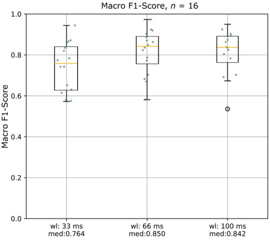 The window lengths 33 ms, 66 ms, and 100 ms were compared to analyze the optimal parametrization of the proposed algorithm. The comparison is depicted in Figure 2. The performance of the algorithm, i.e., the macro F1-scores, was not significantly different between the three windows (all p > 0.05). Thus, further analysis was performed using a 66 ms window, seen as a tradeoff between time responsiveness and computational expense.