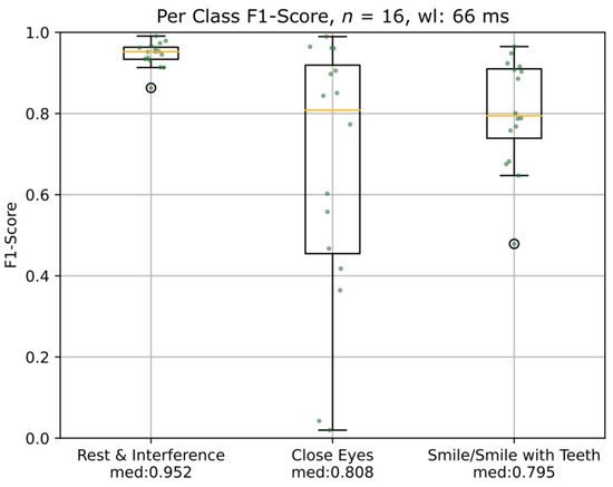 The median macro F1-score, used as a parameter of the classification performance in the present study, was 0.850. Leistritz et al. used needle EMG, i.e., intramuscular EMG, as a signal and revealed a macro F1-score of 0.90 in six patients using a long short-term memory (LSTM) network for classification [9]. Frigerio et al. also used surface EMG but only from the orbicularis oculi muscle and blink triggering [18]. They revealed a macro F1-score of 0.89. This comparison shows that EMG recordings from the ear muscles perform approximately equally to the range obtained by the recording of facial muscles.