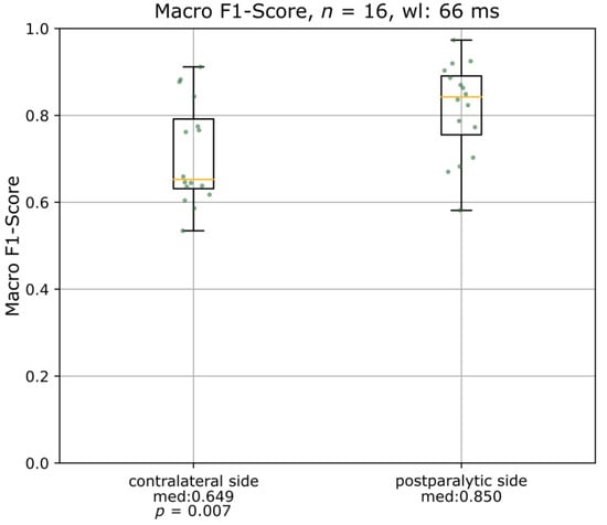 Figure 5 illustrates the comparison between the performance of the algorithm on the auricular EMG of the contralateral and the postparalytic side. The macro F1-scores were significantly higher on the postparalytic side (p = 0.007).