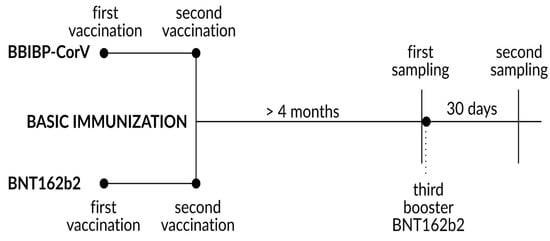 In this prospective study, we examined the total immunoglobulin (Ig) levels against SARS-CoV−2 spike protein 1 receptor-binding domain (anti-SARS-CoV−2 S1-RBD) after the third (second booster) dose of the BNT162b2 vaccine in the BBIBP-CorV vaccinated group (heterologous regimen) compared to a control group of subjects receiving three doses of BNT162b2 (homologous regimen). Following the initial immunization period, a survey was conducted to monitor vaccine efficacy via the incidence of infection and hospitalization by patient questionnaire. Booster immunization was carried out at least 4 months after the first two doses of basic immunization, and baseline (pre-booster) antibody levels were measured on the same day of the administration of booster immunization (first sampling). Following the booster dose, another serum sample was collected after 30 days to determine the induced total level of anti-SARS-CoV−2 spike protein antibodies (second sampling). Figure 1 shows the study design.