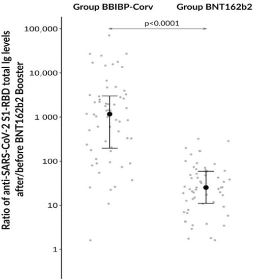 Analysis of the ratio of anti-SARS-CoV−2 S1-RBD total Ig levels after/before BNT162b2 booster vaccine between BBIBP-CorV and BNT162b2 groups.
