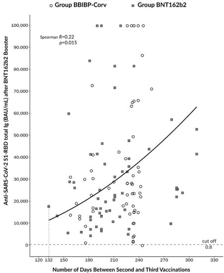 The time interval between the second and third vaccination ranged from 132–309 days. When we analyzed the relationship between anti-SARS-CoV−2 total Ig levels after booster vaccination and the time period that had lapsed between the second and third dose in both groups, a moderate but significant correlation was observed between these variables (Spearman’s R = 0.22; p = 0.015), suggesting that the efficacy of the booster vaccine was the most effective by 6–8 months between basic and booster vaccinations; in the BBIBP-CorV group this took about 8 months longer (Figure 5). Based on these findings, the timing of the administration of the booster vaccine may also have had an impact on induced anti-SARS-CoV−2 total Ig levels that can ensure the sufficient humoral response after immunization.
