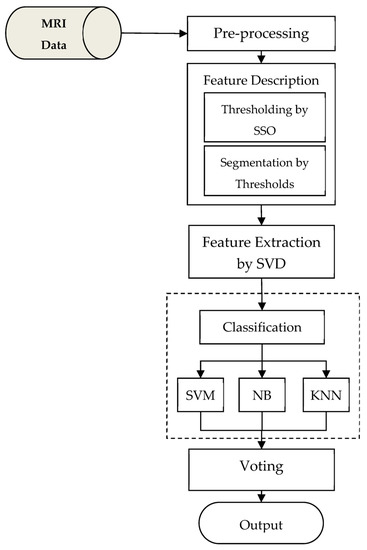 In this section, we will describe the proposed method for the diagnosis of brain tumors using the ensemble technique in detail. This research is an attempt to improve brain tumor diagnosis compared to previous studies. Most of the previous studies use a single classifier for diagnosing brain tumors in MRIs, which leads to a relatively high error rate. The proposed method combines three classifiers as an ensemble system for this task. In this case, multiple classifiers are able to cover the errors of each one. Thus, the ensemble learning may be effective in increasing the accuracy of diagnosis. Figure 1 shows a block diagram of the proposed method.