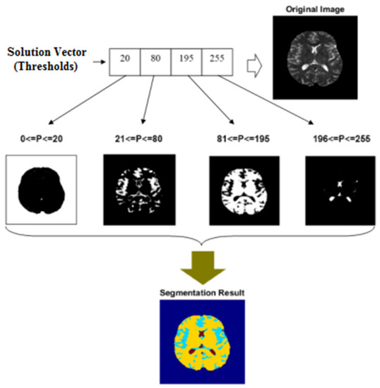 In the example shown in Figure 2, the number of image segments is considered as four. As a result, the solution vector will have a length of four. The first value in the solution vector, for example, is 20. As a result, all pixels with a value in the range are segmented in the first region. This region covers the image’s background (in Figure 2, the member pixels of each region are shown in white). In the same way, the second value in the solution vector is 80. As a result, the second region contains all pixels with a value in the range . The final segmented image will be constructed by combining all of the created regions. The output of this operation is depicted in the lower section of Figure 2. Each area in this diagram is represented by a different color. The image segmentation parameters to be optimized are multilevel thresholding values. As a result, the number of thresholding values equals the length of each solution vector. Each of the previously mentioned optimization parameters can be used to calculate the best solution as a natural number in the interval . In the proposed method, the optimization algorithm’s initial population is generated randomly.