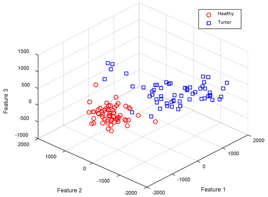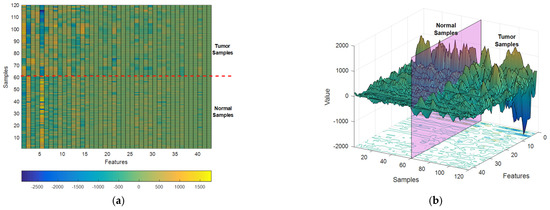 In Figure 5a, features are displayed as columns of the feature matrix and samples are displayed as its rows. In this matrix, the lower half corresponds to features extracted from normal samples and the upper half corresponds to tumor samples. As it is clear in Figure 5, the first columns of the extracted feature matrix show more obvious differences between the two target classes, and this difference decreases as we progress through the extracted features. This attribute, shows that the feature extraction algorithm used in the proposed method can efficiently rank the features. Thus, the features that can show the difference between the target classes more clearly are prioritized. Figure 6 shows the distribution of samples belonging to each of the two target classes based on the first three features extracted by the SVD algorithm.